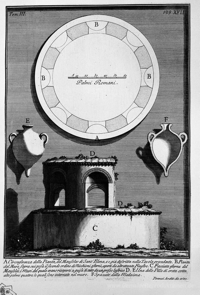 Wir bieten Ihnen eine handgefertigte Reproduktion auf Leinwand des berühmten Kunstwerks 'Die römische Altertümer, t. 3, Tafel XVII. Umfang der Erde und P' von Giovanni Battista Piranesi, aus dem Reproduktionsmuseum.