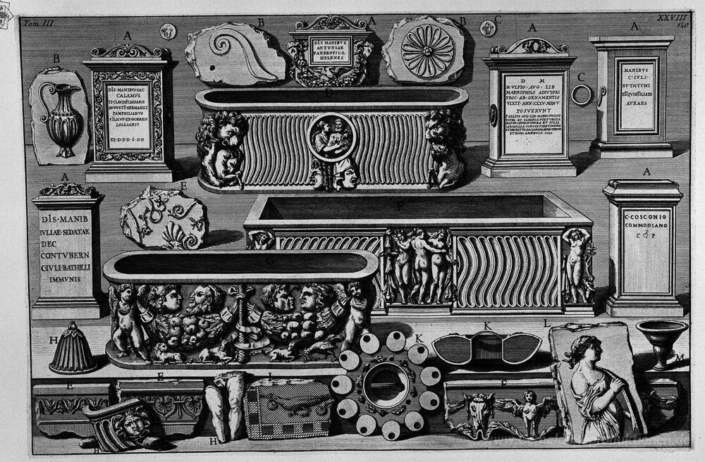 Wir bieten Ihnen eine handgefertigte Reproduktion auf Leinwand des berühmten Kunstwerks 'Die römische Altertümer, t. 3, Tafel XXVIII. Stones, Sarkophage ' von Giovanni Battista Piranesi, aus dem Reproduktionsmuseum.