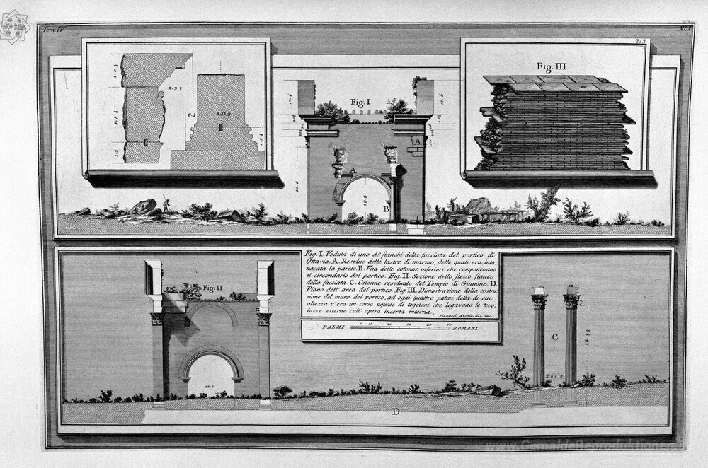 Wir bieten Ihnen eine handgefertigte Reproduktion auf Leinwand des berühmten Kunstwerks 'Die römische Altertümer, t. 4, Tafel XLI. Ansicht einer der Seit' von Giovanni Battista Piranesi, aus dem Reproduktionsmuseum.