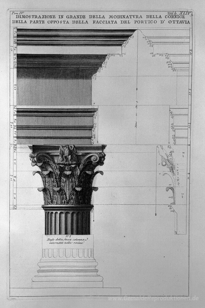 Wir bieten Ihnen eine handgefertigte Reproduktion auf Leinwand des berühmten Kunstwerks 'Die römische Altertümer, t. 4, Tafel XLIV. Vista von modinatura ' von Giovanni Battista Piranesi, aus dem Reproduktionsmuseum.