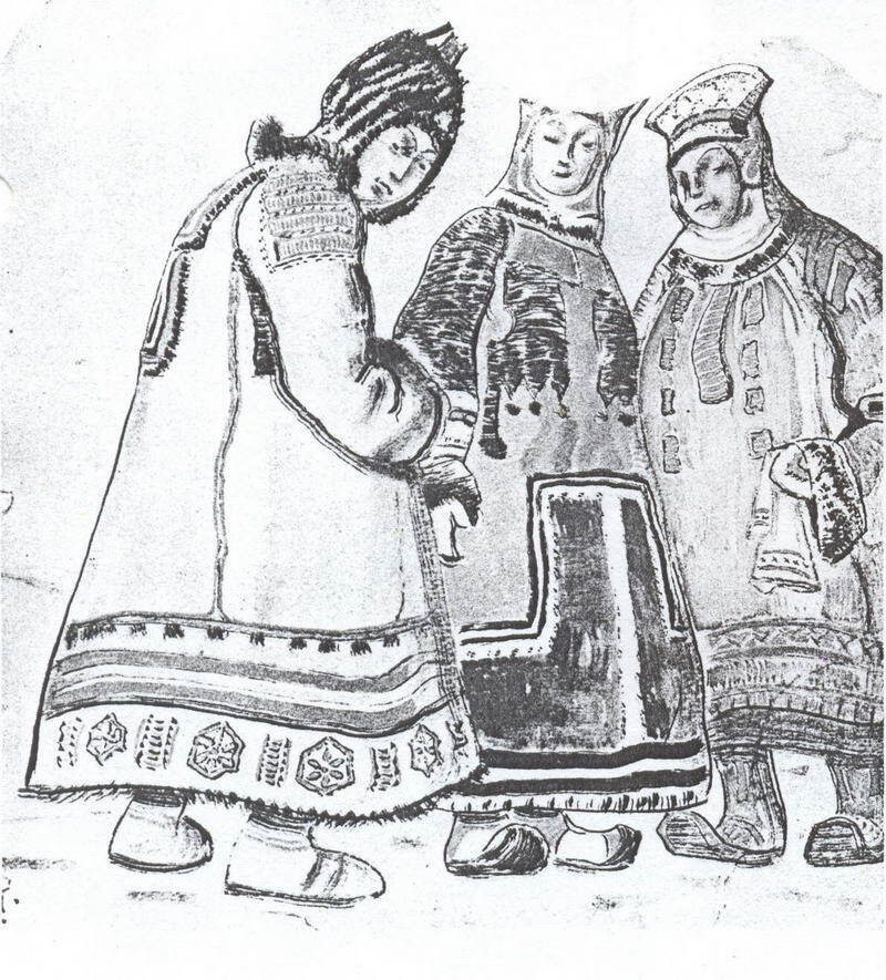 Wir bieten Ihnen eine handgefertigte Reproduktion auf Leinwand des berühmten Kunstwerks 'Die Szene mit drei Figuren in Kostümen' von Nicholas Roerich, aus dem Reproduktionsmuseum.