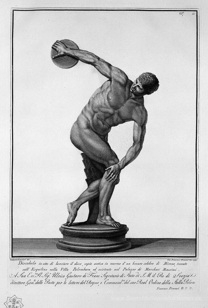 Wir bieten Ihnen eine handgefertigte Reproduktion auf Leinwand des berühmten Kunstwerks 'Diskuswerfer' von Giovanni Battista Piranesi, aus dem Reproduktionsmuseum.