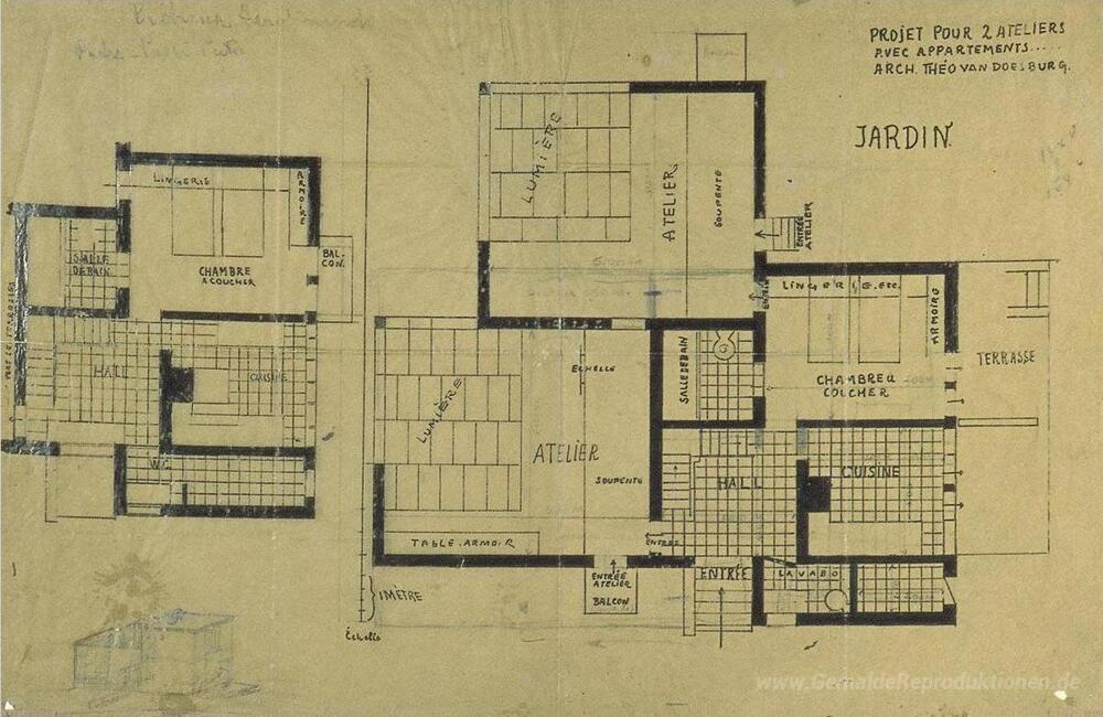 Wir bieten Ihnen eine handgefertigte Reproduktion auf Leinwand des berühmten Kunstwerks 'Doppelzimmer Studio Apartment Design, Pläne und Axonometrie' von Theo van Doesburg, aus dem Reproduktionsmuseum.