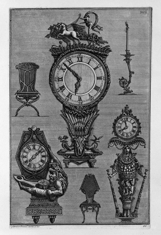 Wir bieten Ihnen eine handgefertigte Reproduktion auf Leinwand des berühmten Kunstwerks 'Drei Uhren, zwei Stühle, ein Kronleuchter' von Giovanni Battista Piranesi, aus dem Reproduktionsmuseum.
