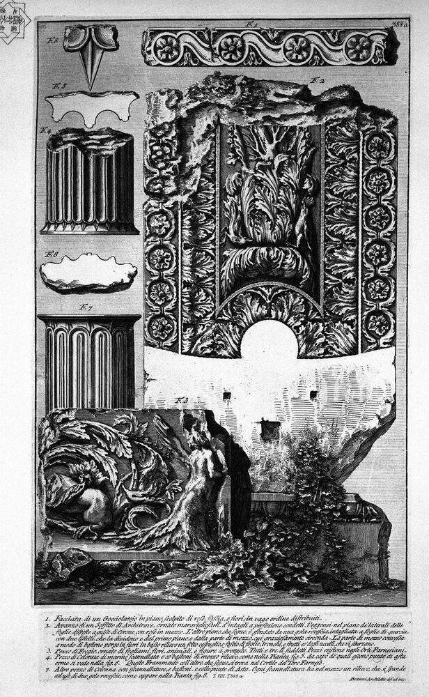Wir bieten Ihnen eine handgefertigte Reproduktion auf Leinwand des berühmten Kunstwerks 'Drip, Decken Architrav, Fries und Stück Ersatzspalten' von Giovanni Battista Piranesi, aus dem Reproduktionsmuseum.