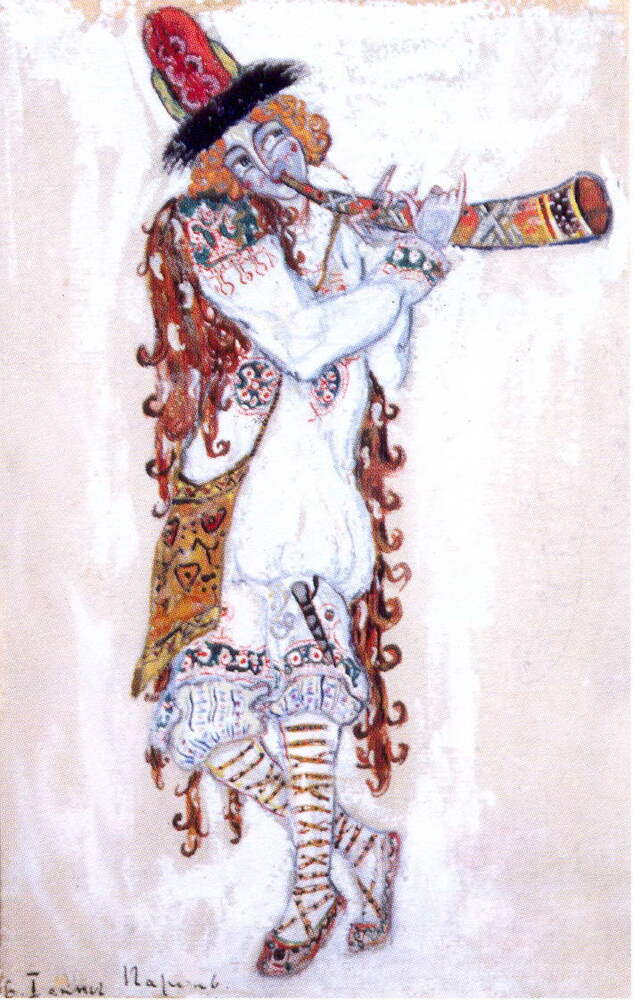 Wir bieten Ihnen eine handgefertigte Reproduktion auf Leinwand des berühmten Kunstwerks 'Ein Kerl, der das Horn spielt' von Nicholas Roerich, aus dem Reproduktionsmuseum.