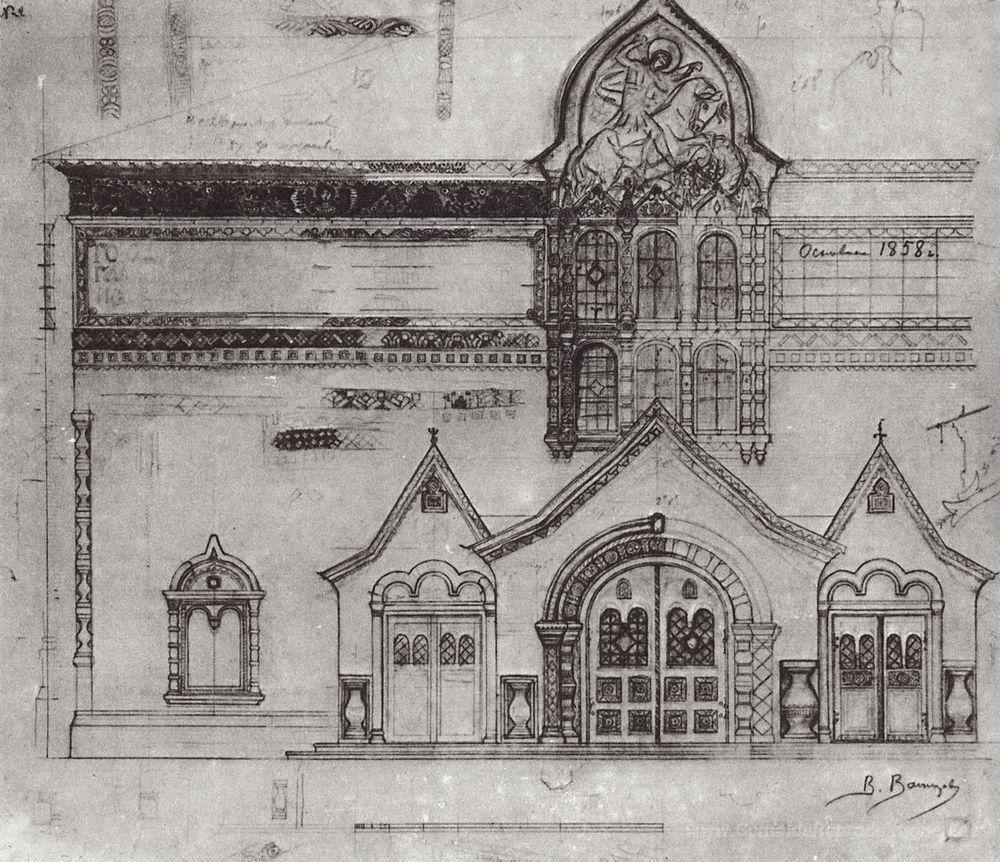 Wir bieten Ihnen eine handgefertigte Reproduktion auf Leinwand des berühmten Kunstwerks 'Entwurf einer Fassade Tretjakow-Galerie' von Viktor Vasnetsov, aus dem Reproduktionsmuseum.