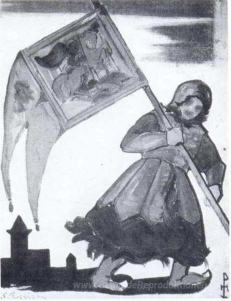 Wir bieten Ihnen eine handgefertigte Reproduktion auf Leinwand des berühmten Kunstwerks 'Fähnrich' von Nicholas Roerich, aus dem Reproduktionsmuseum.