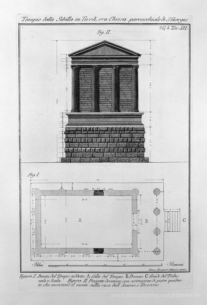 Wir bieten Ihnen eine handgefertigte Reproduktion auf Leinwand des berühmten Kunstwerks 'Fassade und die Seite der Tempel der Sibylle in Tivoli' von Giovanni Battista Piranesi, aus dem Reproduktionsmuseum.