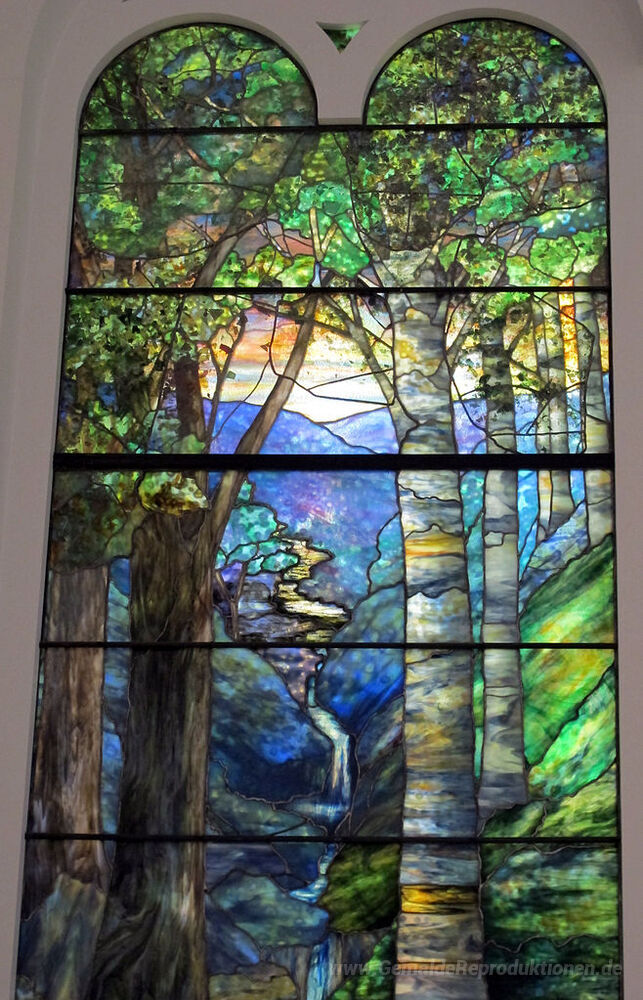 Wir bieten Ihnen eine handgefertigte Reproduktion auf Leinwand des berühmten Kunstwerks 'Fenster mit Sonnenaufgang im Wald im Frühling' von Louis Comfort Tiffany, aus dem Reproduktionsmuseum.