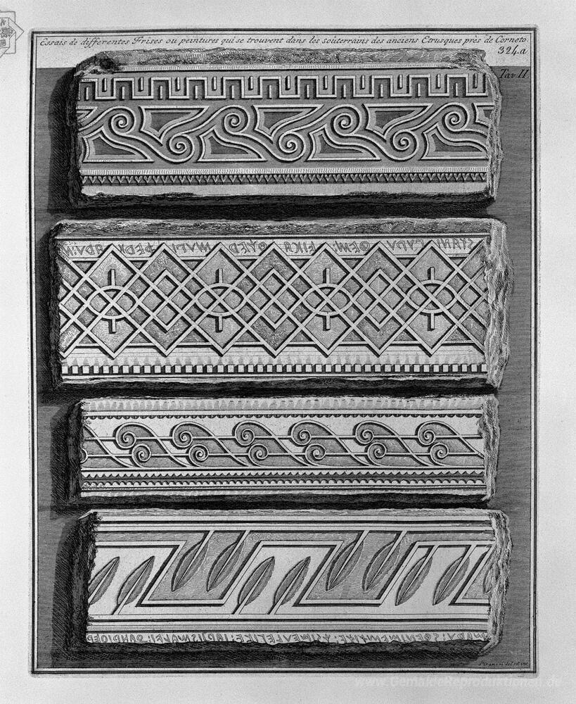 Wir bieten Ihnen eine handgefertigte Reproduktion auf Leinwand des berühmten Kunstwerks 'Friese von etruskischen Gräber von Tarquinia' von Giovanni Battista Piranesi, aus dem Reproduktionsmuseum.