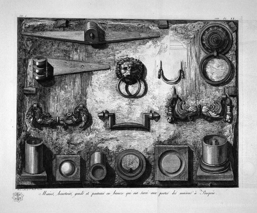 Wir bieten Ihnen eine handgefertigte Reproduktion auf Leinwand des berühmten Kunstwerks 'Handgriffe, Türklopfer, Scharniere, gefunden in Pompeii' von Giovanni Battista Piranesi, aus dem Reproduktionsmuseum.