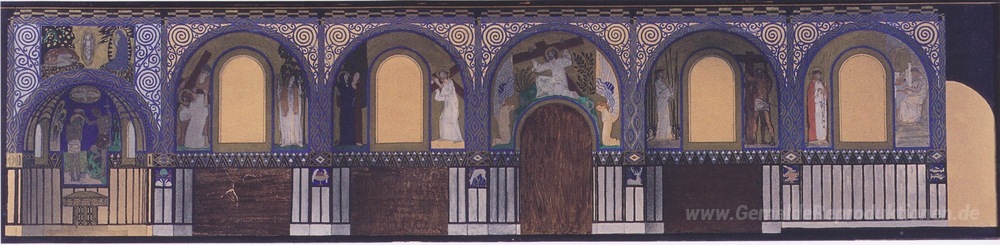 Wir bieten Ihnen eine handgefertigte Reproduktion auf Leinwand des berühmten Kunstwerks 'Heilig Geist Kirche in Düsseldorf, Entwurf für die linke Seitenw' von Koloman Moser, aus dem Reproduktionsmuseum.
