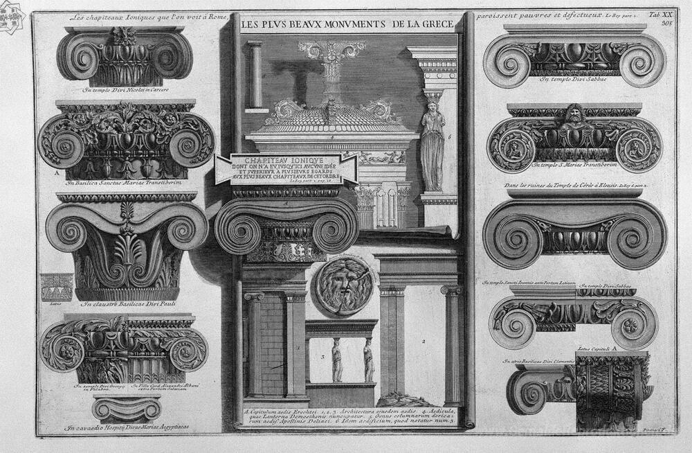 Wir bieten Ihnen eine handgefertigte Reproduktion auf Leinwand des berühmten Kunstwerks 'Ionischen Kapitellen von Rom (S. Maria in Trastevere, St. Paul, ' von Giovanni Battista Piranesi, aus dem Reproduktionsmuseum.