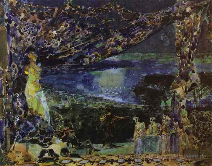Wir bieten Ihnen eine handgefertigte Reproduktion auf Leinwand des berühmten Kunstwerks 'Italienische Nacht (Sketch für den Vorhang in der russischen Pri' von Mikhail Vrubel, aus dem Reproduktionsmuseum.