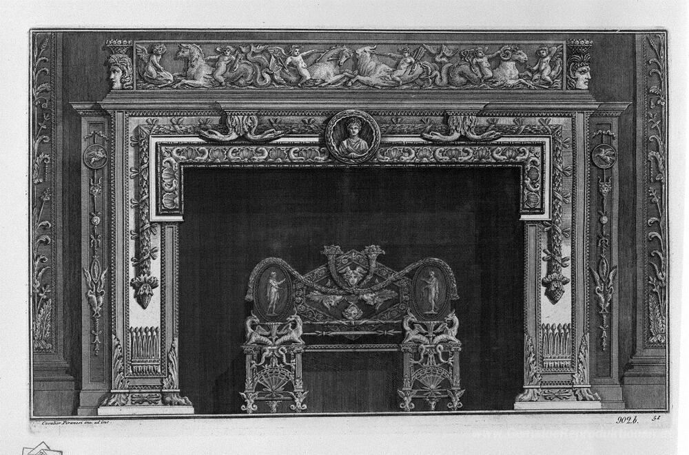 Wir bieten Ihnen eine handgefertigte Reproduktion auf Leinwand des berühmten Kunstwerks 'Kamin, ein zweites Stockwerk auf dem Fries der Putten cavalcanti' von Giovanni Battista Piranesi, aus dem Reproduktionsmuseum.