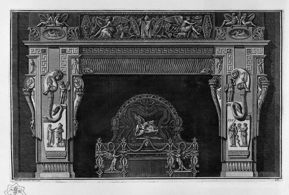 Wir bieten Ihnen eine handgefertigte Reproduktion auf Leinwand des berühmten Kunstwerks 'Kamin: Fries mit Riffelung und Schaber und einem griechischen, e' von Giovanni Battista Piranesi, aus dem Reproduktionsmuseum.