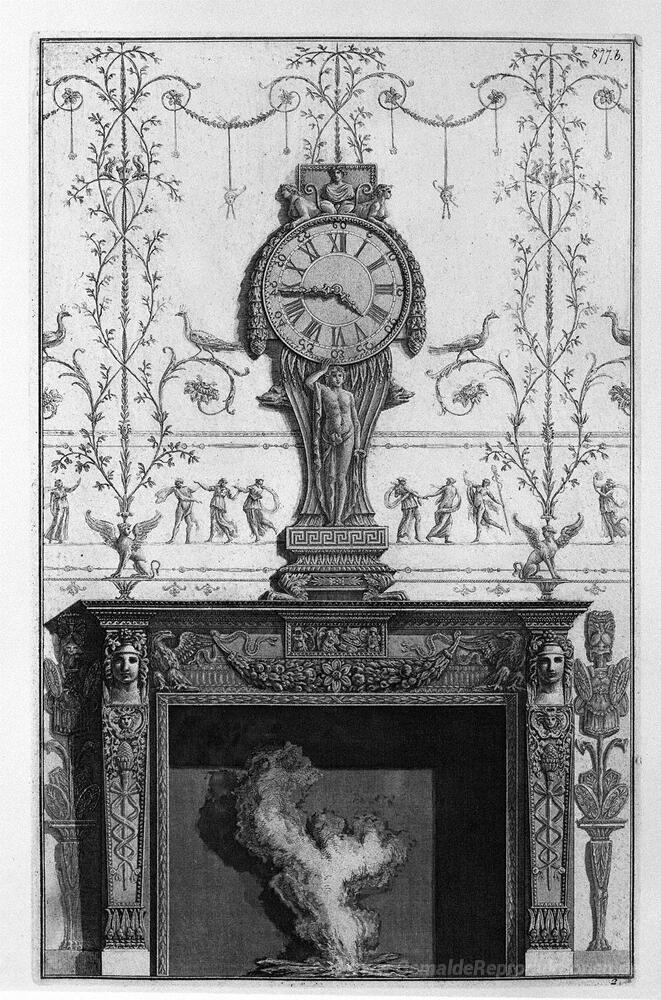 Wir bieten Ihnen eine handgefertigte Reproduktion auf Leinwand des berühmten Kunstwerks 'Kamin: In einer Girlande Fries zwischen zwei Adler über der Eben' von Giovanni Battista Piranesi, aus dem Reproduktionsmuseum.