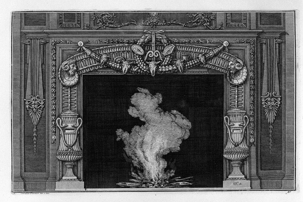 Wir bieten Ihnen eine handgefertigte Reproduktion auf Leinwand des berühmten Kunstwerks 'Kamin: zwei Vasen an den Seiten mit Schlangen' von Giovanni Battista Piranesi, aus dem Reproduktionsmuseum.
