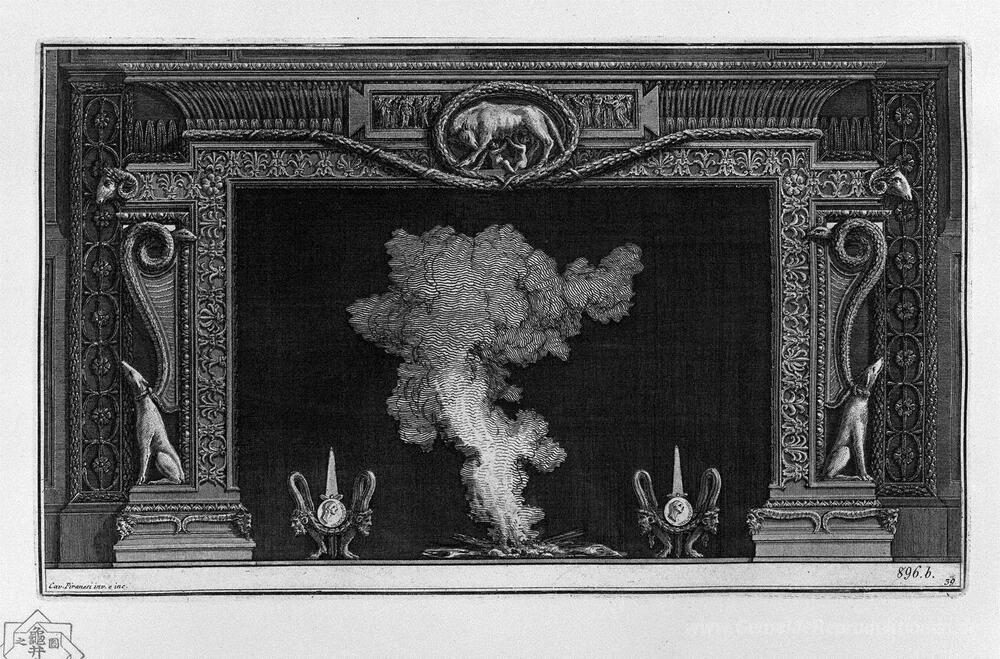 Wir bieten Ihnen eine handgefertigte Reproduktion auf Leinwand des berühmten Kunstwerks 'Kamin, zwei Windhunde, Hocken, an den Seiten, und die römische W' von Giovanni Battista Piranesi, aus dem Reproduktionsmuseum.