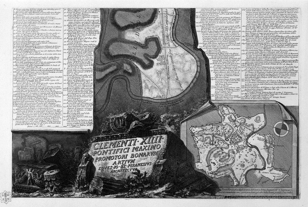 Wir bieten Ihnen eine handgefertigte Reproduktion auf Leinwand des berühmten Kunstwerks 'Karte von Rom und dem Marsfeld mit dem entsprechenden Index und ' von Giovanni Battista Piranesi, aus dem Reproduktionsmuseum.
