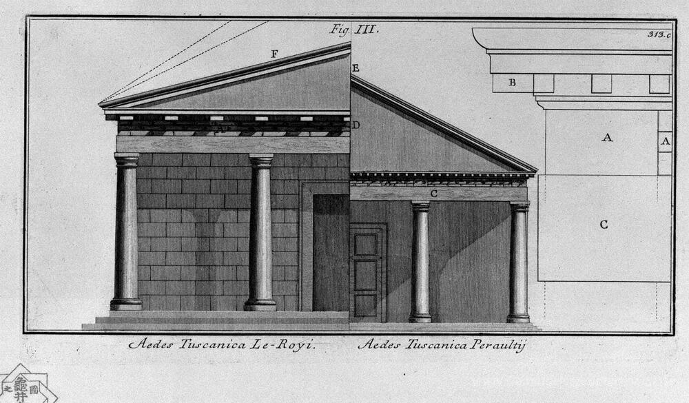 Wir bieten Ihnen eine handgefertigte Reproduktion auf Leinwand des berühmten Kunstwerks 'Karte von Temple Toscano und Säulenbasen (Vitruv, zweiten Perrau' von Giovanni Battista Piranesi, aus dem Reproduktionsmuseum.