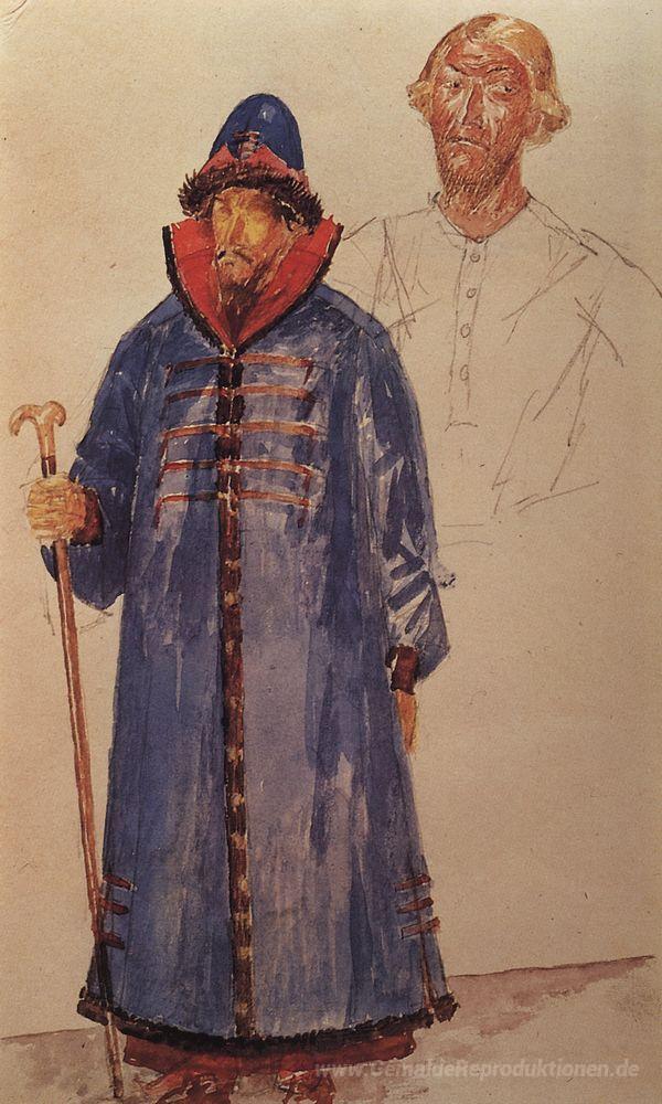 Wir bieten Ihnen eine handgefertigte Reproduktion auf Leinwand des berühmten Kunstwerks 'Kostüme und Make-up, um die Tragödie von Puschkin Boris Godunow' von Kuzma Petrov-Vodkin, aus dem Reproduktionsmuseum.