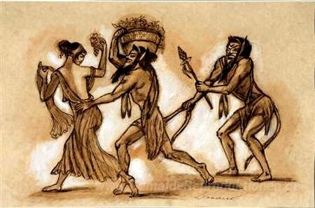 Wir bieten Ihnen eine handgefertigte Reproduktion auf Leinwand des berühmten Kunstwerks 'Kostüm-Studien mit mythologischen Figuren für Ballett "Dionysos"' von Serge Sudeikin, aus dem Reproduktionsmuseum.
