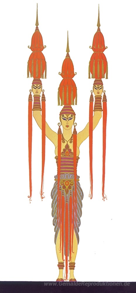 Wir bieten Ihnen eine handgefertigte Reproduktion auf Leinwand des berühmten Kunstwerks 'Laternenträger, Schätze der Indochina' von Erte, aus dem Reproduktionsmuseum.
