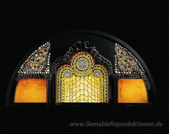 Wir bieten Ihnen eine handgefertigte Reproduktion auf Leinwand des berühmten Kunstwerks 'Lunette Fenster' von Louis Comfort Tiffany, aus dem Reproduktionsmuseum.