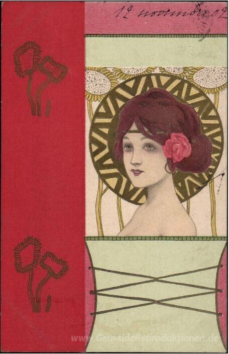 Wir bieten Ihnen eine handgefertigte Reproduktion auf Leinwand des berühmten Kunstwerks 'Mädchen Gesichter mit rotem Rand' von Raphael Kirchner, aus dem Reproduktionsmuseum.