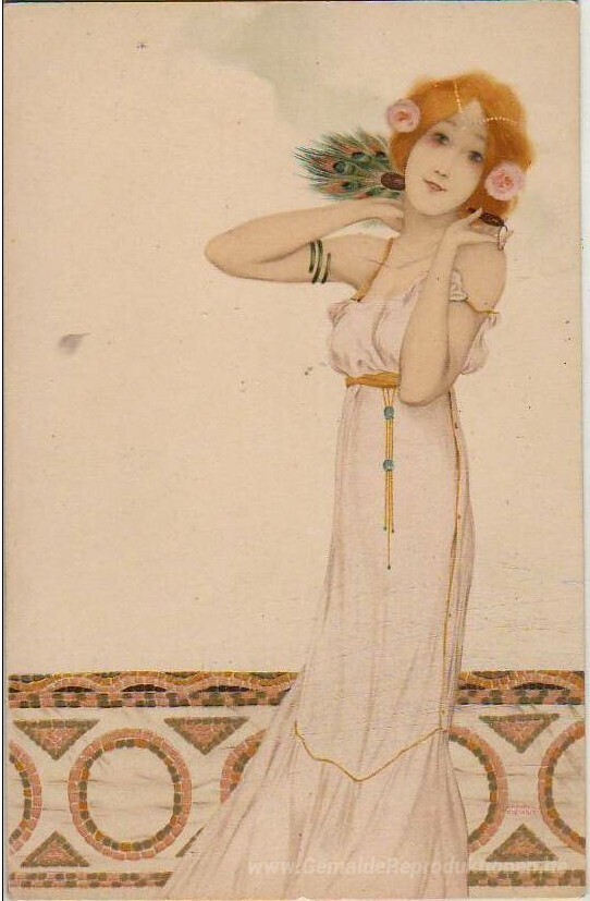Wir bieten Ihnen eine handgefertigte Reproduktion auf Leinwand des berühmten Kunstwerks 'Mädchen mit Blumen zu Füßen' von Raphael Kirchner, aus dem Reproduktionsmuseum.