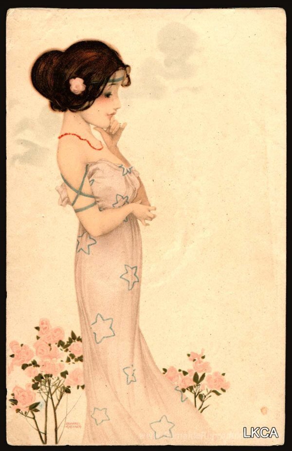 Wir bieten Ihnen eine handgefertigte Reproduktion auf Leinwand des berühmten Kunstwerks 'Mädchen mit Blumen zu Füßen' von Raphael Kirchner, aus dem Reproduktionsmuseum.