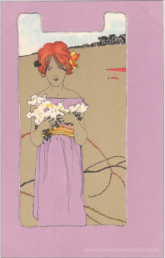 Wir bieten Ihnen eine handgefertigte Reproduktion auf Leinwand des berühmten Kunstwerks 'Mädchen mit lila umgibt' von Raphael Kirchner, aus dem Reproduktionsmuseum.