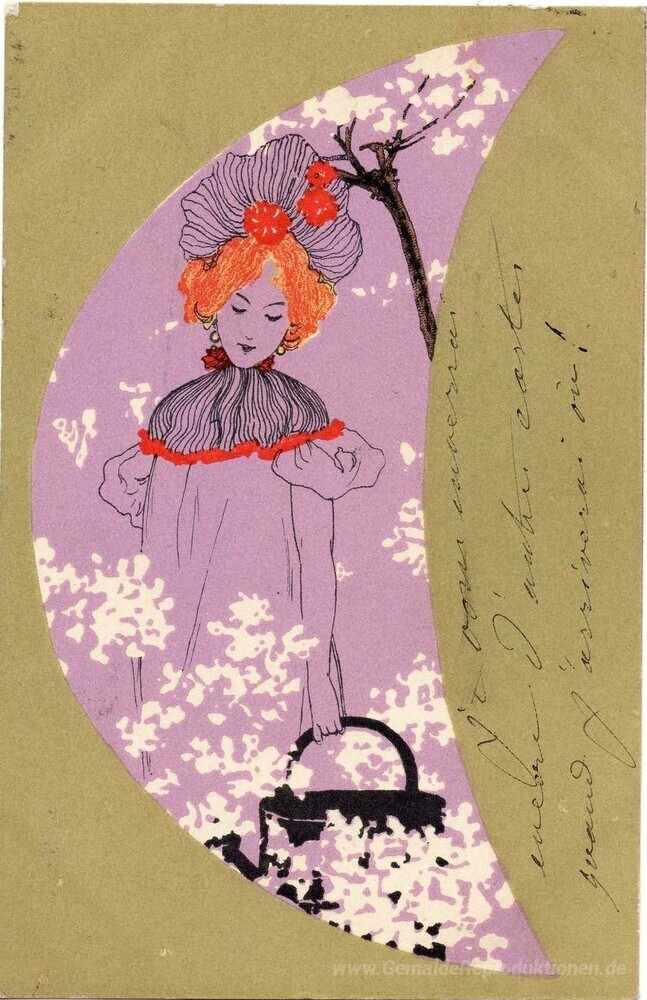 Wir bieten Ihnen eine handgefertigte Reproduktion auf Leinwand des berühmten Kunstwerks 'Mädchen mit olivgrün umgibt' von Raphael Kirchner, aus dem Reproduktionsmuseum.