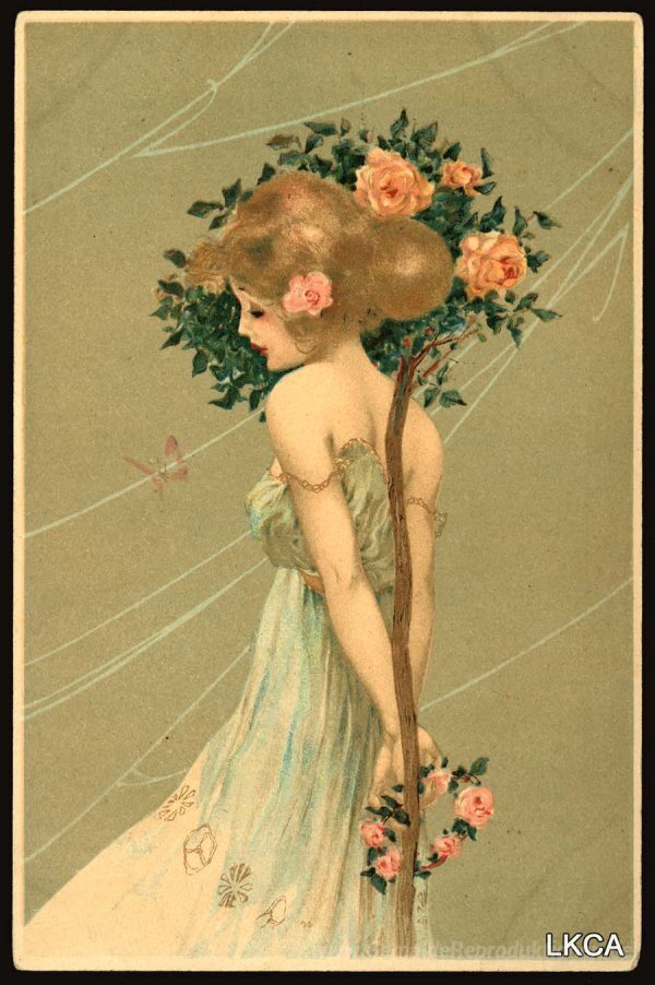 Wir bieten Ihnen eine handgefertigte Reproduktion auf Leinwand des berühmten Kunstwerks 'Mädchen umgeben von Pflanzen' von Raphael Kirchner, aus dem Reproduktionsmuseum.