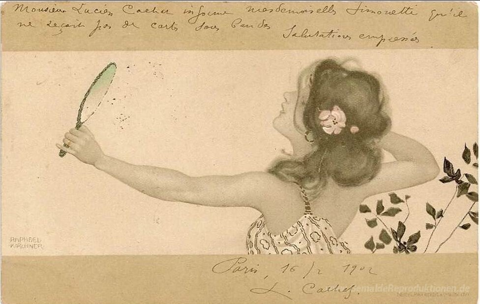 Wir bieten Ihnen eine handgefertigte Reproduktion auf Leinwand des berühmten Kunstwerks 'Mädchen zwischen braun-grünen Grenzen' von Raphael Kirchner, aus dem Reproduktionsmuseum.