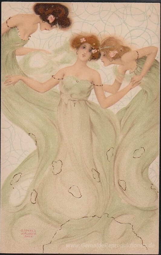 Wir bieten Ihnen eine handgefertigte Reproduktion auf Leinwand des berühmten Kunstwerks 'Mayflyes' von Raphael Kirchner, aus dem Reproduktionsmuseum.