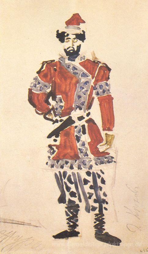 Wir bieten Ihnen eine handgefertigte Reproduktion auf Leinwand des berühmten Kunstwerks 'Prinzen Jäger (Kostümentwurf für die Oper "Die Zauberin")' von Mikhail Vrubel, aus dem Reproduktionsmuseum.