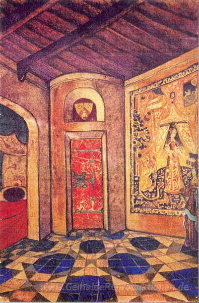 Wir bieten Ihnen eine handgefertigte Reproduktion auf Leinwand des berühmten Kunstwerks 'Raum der Königin Anna' von Nicholas Roerich, aus dem Reproduktionsmuseum.