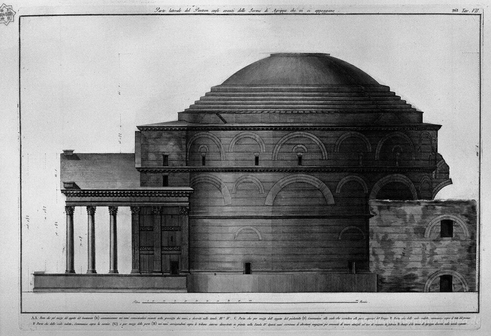 Wir bieten Ihnen eine handgefertigte Reproduktion auf Leinwand des berühmten Kunstwerks 'Seitenteil des Pantheon bleibt der Bäder von Agrippa, die unters' von Giovanni Battista Piranesi, aus dem Reproduktionsmuseum.