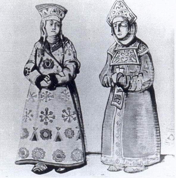 Wir bieten Ihnen eine handgefertigte Reproduktion auf Leinwand des berühmten Kunstwerks 'Sketch von Kostümen für "Schneewittchen"' von Nicholas Roerich, aus dem Reproduktionsmuseum.