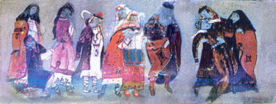 Wir bieten Ihnen eine handgefertigte Reproduktion auf Leinwand des berühmten Kunstwerks 'Skizzen von Kostümen für "Fürst Igor"' von Nicholas Roerich, aus dem Reproduktionsmuseum.