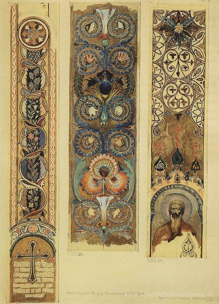 Wir bieten Ihnen eine handgefertigte Reproduktion auf Leinwand des berühmten Kunstwerks 'Skizzen von Ornamenten bemalt Vladimir Cathedral' von Viktor Vasnetsov, aus dem Reproduktionsmuseum.