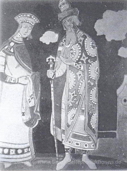 Wir bieten Ihnen eine handgefertigte Reproduktion auf Leinwand des berühmten Kunstwerks 'Snow Maiden und Berendey' von Nicholas Roerich, aus dem Reproduktionsmuseum.