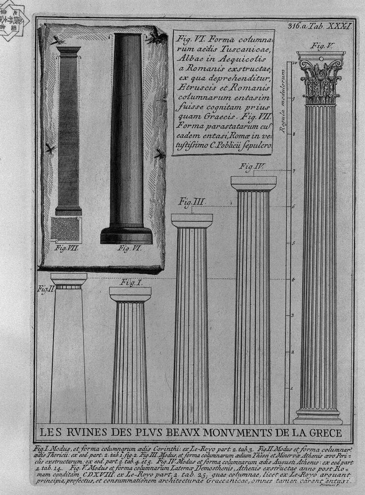Wir bieten Ihnen eine handgefertigte Reproduktion auf Leinwand des berühmten Kunstwerks 'Spalten Doric, korinthische und toskanische (aus Le Roy)' von Giovanni Battista Piranesi, aus dem Reproduktionsmuseum.