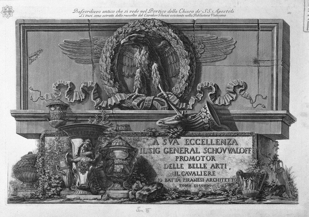 Wir bieten Ihnen eine handgefertigte Reproduktion auf Leinwand des berühmten Kunstwerks 'Titelseite. Über dem Adler der Heiligen Apostel römischen Portik' von Giovanni Battista Piranesi, aus dem Reproduktionsmuseum.