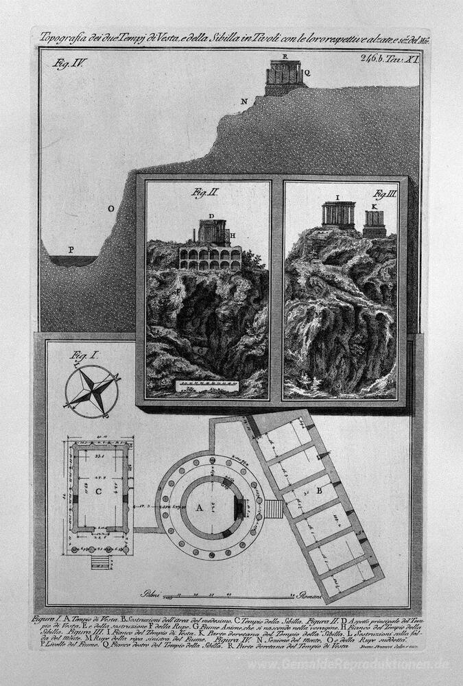 Wir bieten Ihnen eine handgefertigte Reproduktion auf Leinwand des berühmten Kunstwerks 'Topographie der beiden Zeiten der Vesta und der Sibyl in Tivoli ' von Giovanni Battista Piranesi, aus dem Reproduktionsmuseum.