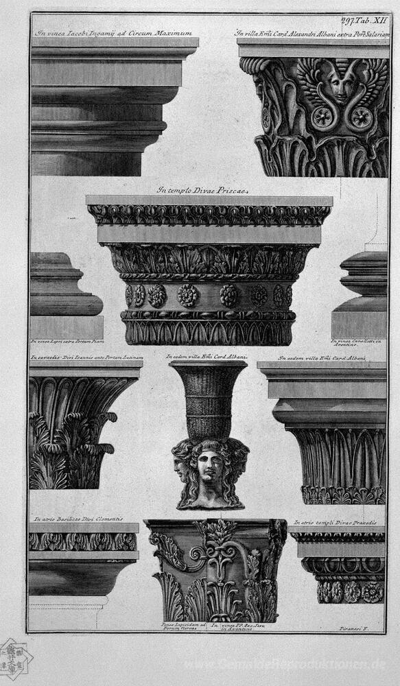 Wir bieten Ihnen eine handgefertigte Reproduktion auf Leinwand des berühmten Kunstwerks 'Verschiedene Hauptstädten (Villa Albani, S Prisca, Praxedes S, S' von Giovanni Battista Piranesi, aus dem Reproduktionsmuseum.