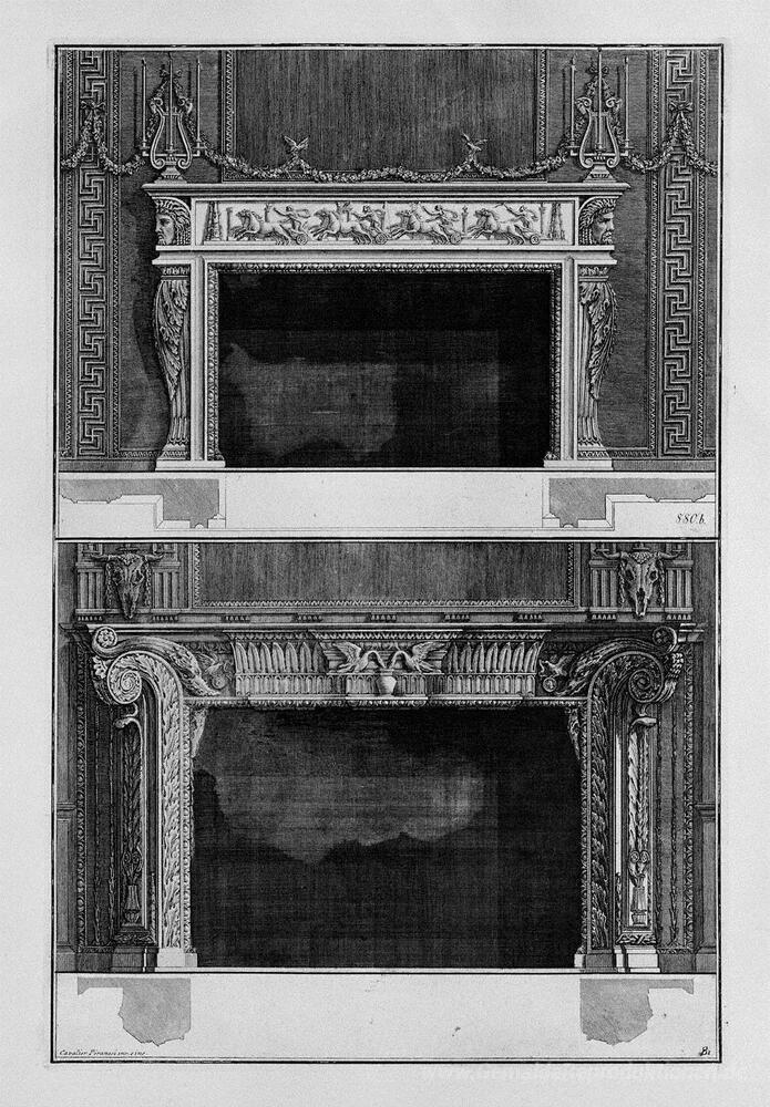 Wir bieten Ihnen eine handgefertigte Reproduktion auf Leinwand des berühmten Kunstwerks 'Zwei Kamine mit dem Träger 4 in der Wagenrennen im Zirkus, der i' von Giovanni Battista Piranesi, aus dem Reproduktionsmuseum.